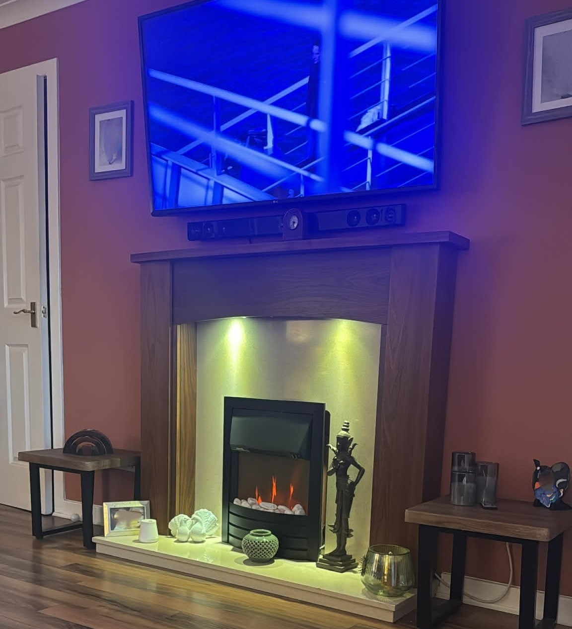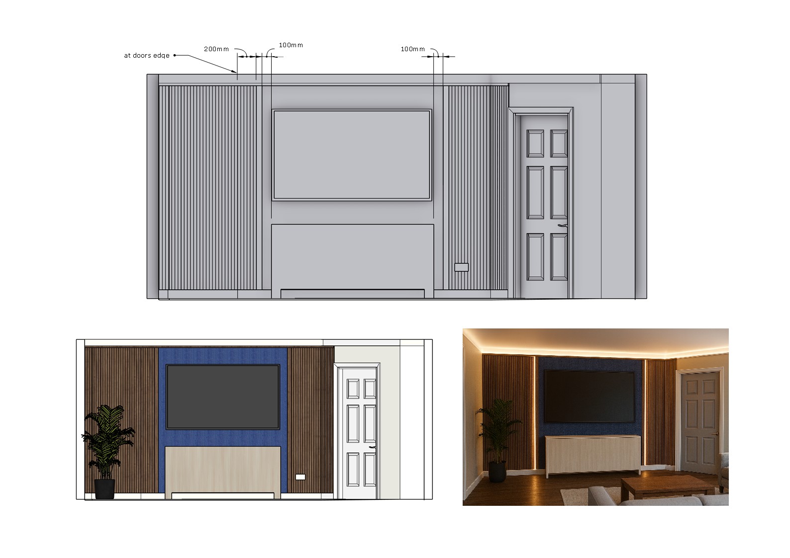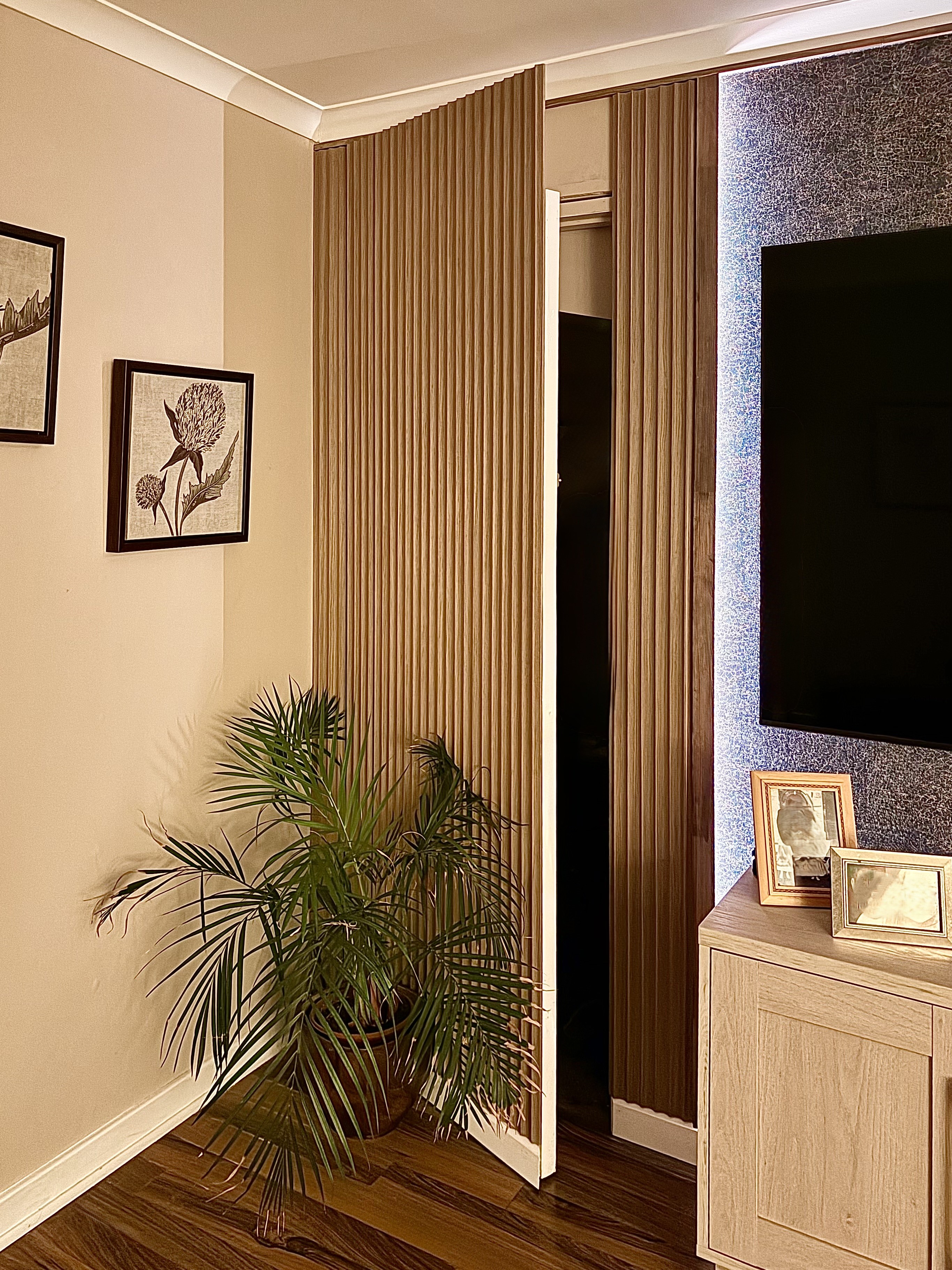 The design focuses on light walnut fluted panelling, soft blue wallpaper, and integrated LED lighting to add warmth, depth, and visual interest. A seamless hidden door was designed into the panelling to maintain clean lines and uninterrupted flow, while a white-wash walnut TV unit provides a functional yet refined focal point.